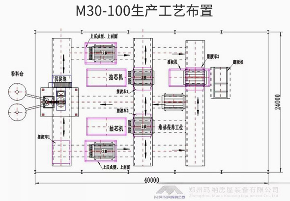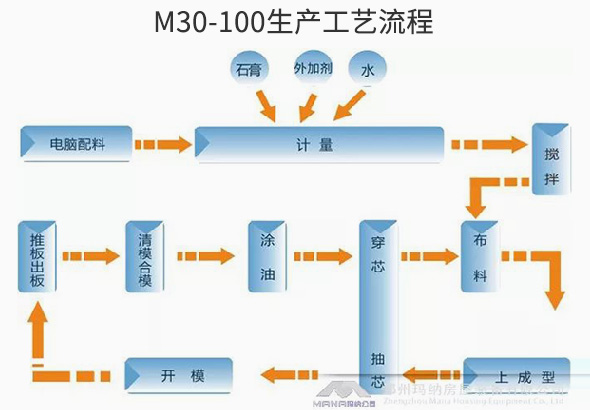 M30石膏墻板生產線主要由瑪納第三代立模成型主機、大抽拔力抽芯機、出板接板合板翻板機構、上壓成型機、自動圍擋刮面機、攪拌系統等重要部分組成,其中很多單體設備都是鄭州瑪納的MN技術產品,受到國家知識產權的保護。