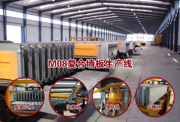瑪納M08復合墻板設備生產線價格從幾十萬到幾百萬不等,其主要設備組成是:集約式低能耗養護室(快速養護墻板構件及低耗能技術);第三代成組立模(不漏漿及大剛度技術);立模回轉機(無線控制變頻行走及精確軌道對位);上抹面成型機(實現墻板上面成型);合板翻板機構(完成合板及翻板技術);壓力注料系統(可控注料);推板機構(集合出板及隔板清理復合技術)。