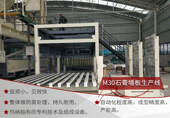 我公司M30石膏墻板生產線以成組立模成型技術為核心,添加了自主研發的智能抽芯系統,突破了傳統石膏墻板成型裝備的技術瓶頸。實現了石膏墻板的自動化、標準化的綠色無污染生產,該線年產量達100萬平米,每20分鐘即可脫模一次。隨著裝配式房屋的政策調整,石膏墻板的市場會越來越大,同時也為建筑市場的發展帶來了新的活力!