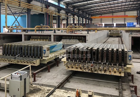 瑪納公司m03自動化陶粒墻板生產線采用成組立模工藝,模具液壓開合,端模整體開合,板長自動調整,墻板上榫槽自動成型,年生產能力50萬m2。