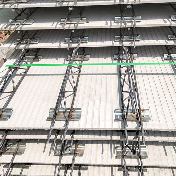 鋼筋桁架薄型高性能混凝土疊合樓板是由鋼筋桁架、1.5-2.5cm預(yù)制混凝土底層組成的疊合樓板。施工階段由鋼筋桁架和底部混凝土形成整體支撐體系,承受濕混凝土、施工荷載,無需其他模板支撐,混凝土澆筑完成后鋼筋桁架作為樓板使用階段的受力鋼筋,承受使用階段荷載,底部混凝土界面后期可以直接裝飾裝修。