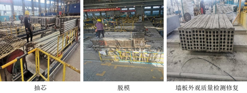 之后進行抽芯處理,經過表面質量檢測和修復后,開始進行蒸壓養護處理,蒸壓養護過程分為升壓、恒壓、降壓三個過程:升壓階段(15min 0.10MPa;30min 0.25MPa;45min 0.35MPa;1h 0.50MPa)、恒壓階段(2h、0.5±0.05MPa)、降壓階段(15min 0.40MPa;30min 0.30MPa;45min 0.20MPa;1h 0.15MPa;1h15min 0.10MPa;1h30min 0MPa)、降溫冷卻 30min。