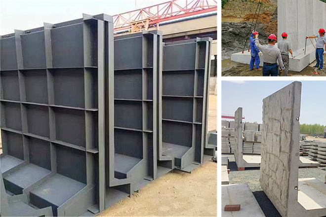預制擋土墻模具由底模、側模、端模、支撐裝置、緊固裝置等組成,也可根據需要增加液壓閉合、振搗、養護等功能模塊。