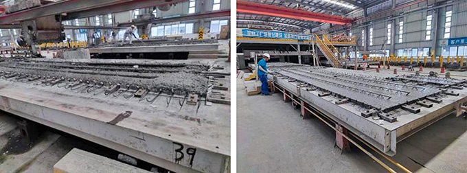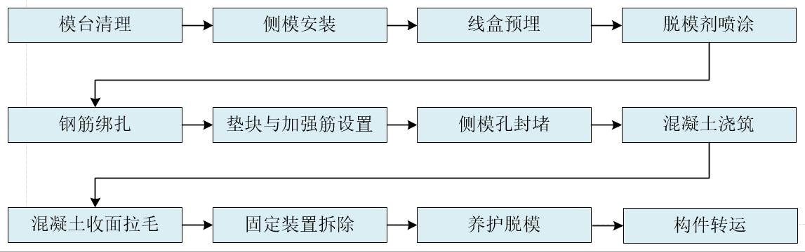 疊合板生產采用模臺流水線生產,模臺可整體移動,不同區域負責不同工藝,每道工藝完成后,模臺移動到下一個區域。疊合板生產流程如下: