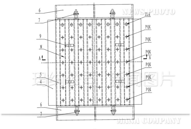 成組立模是建筑用條形墻板的專用生產設備。它是以成型模腔M為主體,成型模腔M是由底架3、底板4、隔板5、開啟堵板6、上壓板8等模塊圍成的六面體成型空腔(詳見圖1~圖3)。條形墻板就是通過向成組立模的成型模腔M中澆注所需板材的料漿并經過凝固、養護后得到的外形與成型模腔完全一致的六面體。條形墻板的六個面分別是兩個側面、四個邊模面。其中墻板的側面是由垂直于水平底邊模并等間距布置的隔板來實現其成型的,即條形墻板的側面在成組立模中成型時一定處于與地面垂直的狀態。但四條邊模面在傳統成組立模中的安裝位置分為兩種:側立式和豎立式。所謂側立式是指兩個長邊邊模面呈上、下水平對稱布置,兩個短邊邊模面呈左、右豎直對稱布置;而豎立式正好與此相反,是兩個短邊邊模面呈上、下水平對稱布置,兩個長邊邊模面呈左、右豎直對稱布置。但無論是哪種成型拼裝方式,總有兩個邊模面是呈上、下水平對稱布置的。當通過注料孔(ZLK)向封閉的模腔中進行壓力注料時,隨著注入料漿的增多模腔里的空氣逐步被擠壓上移,最后聚集到上壓板8附近。如果氣體不及時排出,對上壓板附近料漿的流動及上成型面的成型質量都有嚴重的不良影響。為了使模腔內的氣體能夠排出,在上壓板8上需設置排氣孔(PQK)。為了使用排氣順暢,排氣孔的數量越多越好。但是在排氣孔附近的成型質量肯定不理想,排氣孔數量越多則相應的上成型面(即上邊模面)的成型質量越差。而且,即使排氣孔數量再多,其中間也有一定的間隔距離,再加上排氣孔容易阻塞(因為排氣孔不可能太大),以至于上成型面不可避免地經常發生“氣堵”或者出現大氣泡,嚴重影響上成型面(即上邊模面)的成型質量。