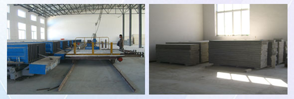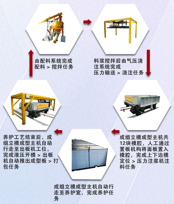 整個(gè)過(guò)程:配料→攪拌→置板→壓力輸送→澆注入模→養(yǎng)護(hù)→開(kāi)模→出板機(jī)出板→循環(huán)
